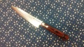 核家族化でこれ一本で済ます方も増えています。 刃部 V10ダマスカス鋼。刃渡り 142ミリ。 全長 250ミリ。さびにくいです。マホガニー柄。 鞘も別売りでございます。(5寸ペティ用が合います。)