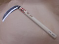 木草用中厚鎌。 六寸刃。 本職用。 片刃。 刃部 安来鋼白紙。刃渡り 160ミリ。柄の長さ 360ミリ。 さびます。