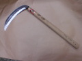 木草用中厚鎌。 七寸刃。 本職用。 片刃。 刃部 安来鋼白紙。刃渡り 190ミリ。柄の長さ 390ミリ。 さびます。